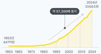 절망적이었던 상황 속에서 한국은 유례없이 빠른 성장을 이뤄냈습니다. 1953년 447억 원이던 GDP는 2024년 2,556조 8,574억 원으로 무려 5만 7천 배 증가했습니다.. 1953년 67달러에 불과했던 1인당 GNI도 2024년에는 3만 6,624달러로 훌쩍 뛰었습니다.