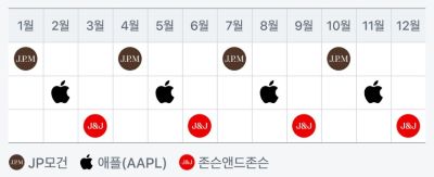 위의 예시처럼 배당 시기별로 배당주를 한 종목씩 사두면, 배당으로 1년 내내 제2의 월급을 받는 것이 가능해집니다. 예를 들어, JP모건과 애플, 존슨앤드존슨을 함께 매수하면 한 달도 빠지지 않고 각 회사로부터 배당을 받을 수 있는 것입니다.