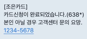내가 발급하지 않은 카드가 개설되었다거나, 구매하지 않은 물건이 결제되었다는 문자를 보내는 경우도 있습니다. 취소하기 위해 전화를 하면 본인인증을 해야 한다며 개인정보를 탈취하는 수법입니다.