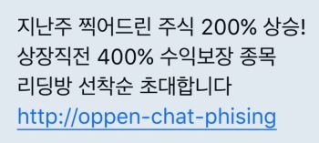 투자를 유도하는 스팸 문자도 여전히 성행하고 있습니다. 비상장주식, 코인 등으로 높은 수익률을 보장한다며 채팅방에 초대하거나 링크를 클릭하게 하는 방식입니다.