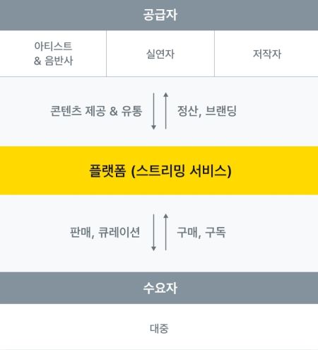 음악 스트리밍 서비스는 아티스트 및 레이블이라는 공급자와 청취자라는 수요자를 연결하여 음악이라는 재화를 효율적으로 거래할 수 있도록 중개합니다.