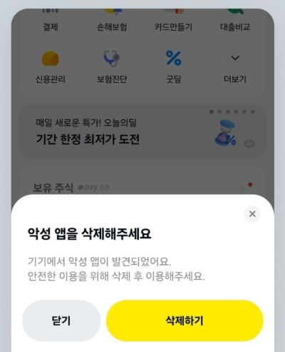 카카오페이는 문제의 플랫폼과 관련된 악성코드가 설치되어 있는 경우 탐지해서 알려주고 있습니다.