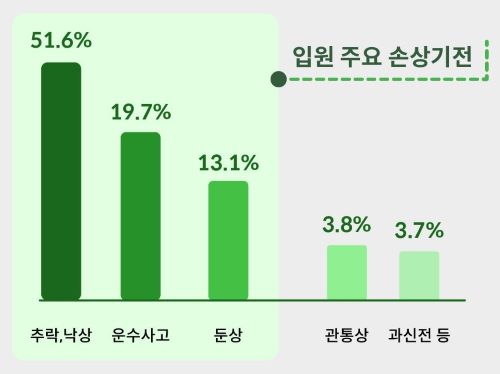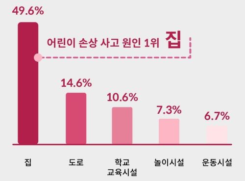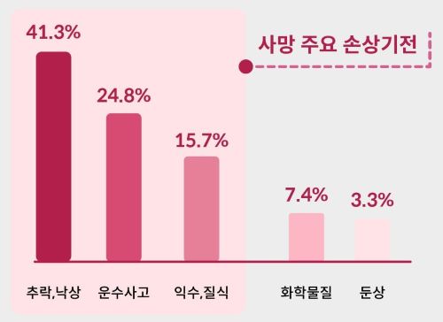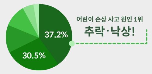 입원을 유발하는 추락 낙상 사고는 51.6%, 사망을 유발하는 추락 낙상 사고는 41.3%. 추락 낙상이 어린이 손상 사고의 대부분을 차지합니다.