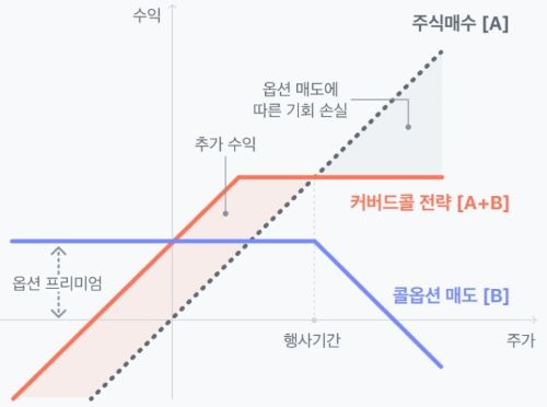커버드콜(Covered Call)이란, 주식이나 채권 같은 자산을 매수하는 동시에 그 자산에 대한 콜옵션을 매도하는 전략입니다.