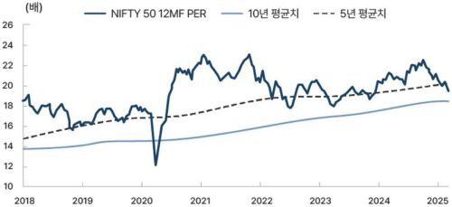 인도 주식시장은 최근 6개월에 가까운 조정을 거친 후, 밸류에이션 부담이 많이 해소됐습니다. NIFTY 50의 12MF PER은 22.5배에서 19.3배로 하락해 장기 평균에 근접했습니다.
