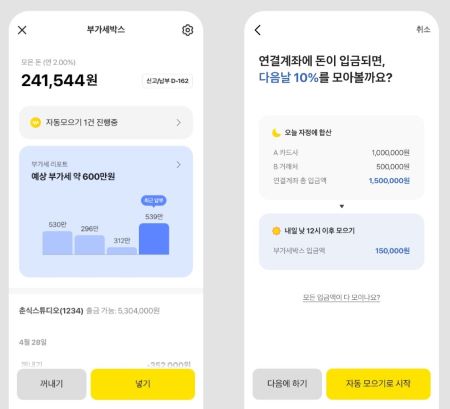 이럴 땐 부가세박스를 써보실 바랍니다. 매출 통장에 연결해 입금액의 10%를 자동으로 모아줍니다. 납세 기간이 됐을 때 모아둔 금액을 꺼내 내면 됩니다.