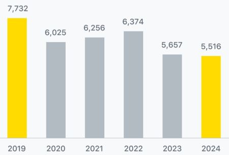 카페에서 결제한 전체 금액은 계속 증가하고 있지만, 한 번 결제할 때 쓰는 금액은 오히려 줄어들고 있습니다. 카페업종의 평균 건당 구매 단가는 2018년 7,700원에서 2024년 상반기 5,500원으로 낮아졌습니다.