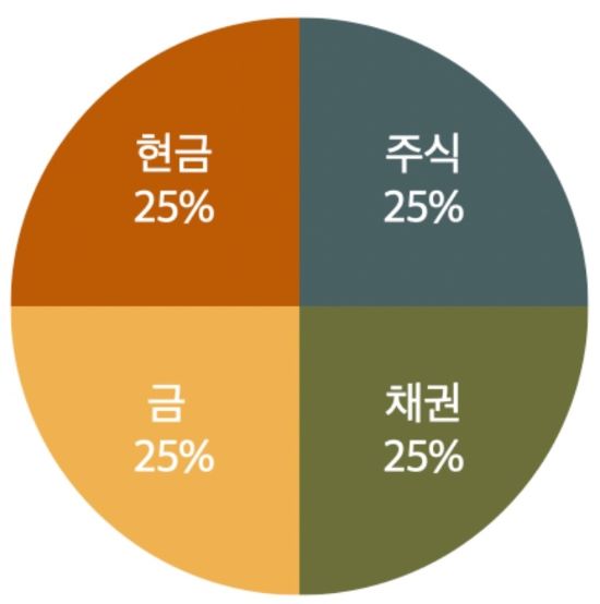 포트폴리오 투자 중 가장 기본적인 레시피가 있습니다. 영구적으로(PPermanent) 수익률을 올릴 수 있다는 의미로 영구 포트폴리오라고 합니다. 바로 이런 비중으로 투자하는 겁니다.
