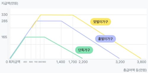 | 소득 기준 | 2,200만 원 미만 | 3,200만 원 미만 | 3,800만 원 미만 |