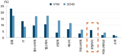 < 업종 비중 유사한 편이나, SCHD는 유틸리티 비중 0% >