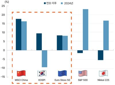 < 연초 이후 미국 대비 중국, 한국, 유럽 주식시장 강세 >