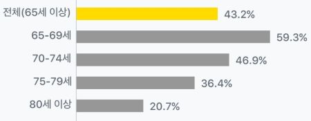 국가데이터처에 따르면 65세 이상 고령층 중 43.2%가 경제활동에 참여하는 것으로 나타났습니다. 이는 전체 인구 근로자비율(64.0%)의 3분의 2 수준입니다. 남성 근로비율이 51.2%, 여성 근로비율이 36%로 남성의 근로 비율이 더 높았는데, 여성이 남성보다 고령일수록 근로자 비율이 크게 감소하는 것으로 나타났습니다.